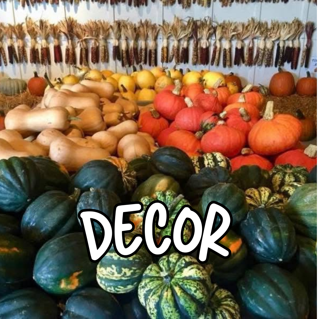 Decor in our Market includes: pumpkins, gourds, cornstalks, straw bales, Indian corn, popcorn, squash, baking pumpkins, mums, apples, pumpkin carving kits and stickers, candles, etc.